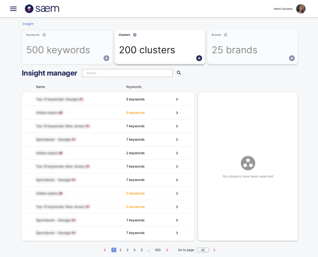 In SAEM Insight the keyword clustering functionality allows you to analyze your brand's performance within a group of keywords rather than by all the similar keywords individually. So you can think of the keyword clusters as kind of the groups gathering your targeted online buyers who have the similar search intent. When you use the [Brand Monitoring](https://help.saem.io/reports-and-metrics/brand-monitoring) report it will analyze and tell you how much exposure is your brand getting in those keyword clusters and how many potential clients could you be getting from each of the clusters.